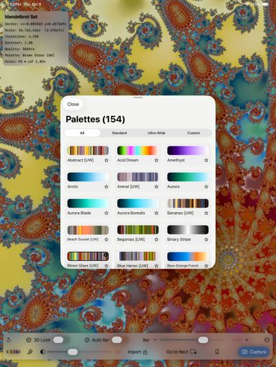 Mandelbrot Metal, a leading fractal exploration app, now features over 120 palettes. Among these are more than 20 Ultra-Wide palettes, which utilize 768 color steps for ultra-smooth gradients. These Ultra-Wide palettes are marked with “[UW]” on our community portal.