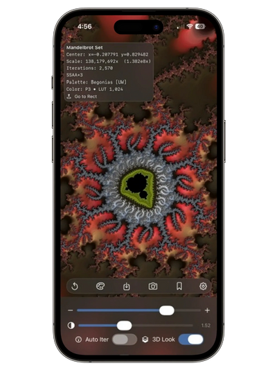 Although this was on our roadmap for next year, we decided that it was too cool a feature not to try to get into the first release. 3D Look mode adds depth and realism with surface shading that brings fractals to life — revealing contours, highlights, and texture.